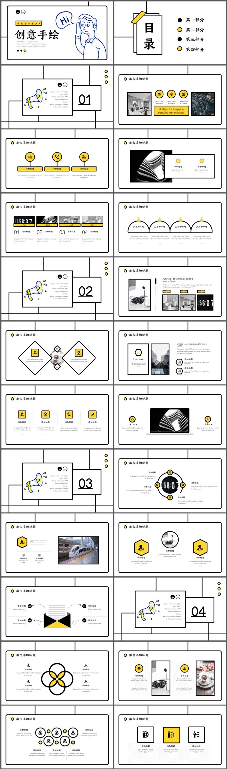 本套PPT由23张黑色手绘风幻灯片图表,搭配PPT文字排版。另外使用了小清新的咖啡插图、耳机插图、建筑插图等装饰。