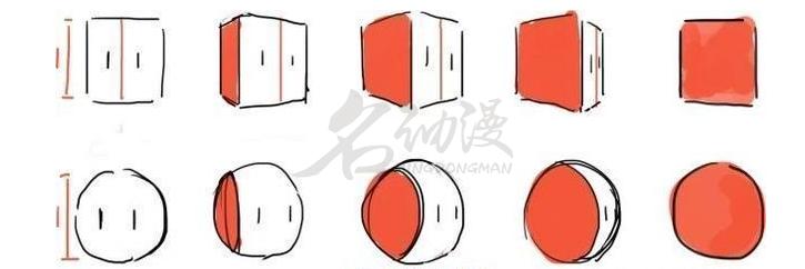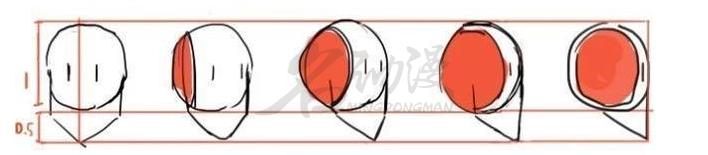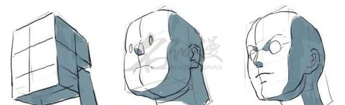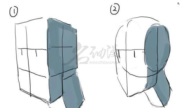 把头部结构简单粗暴概括为一个长方体的结构,然后确定面部的朝向,这就是一些同学所熟知的“方块旋转”法。当然我们也可以“化方为圆”处理。