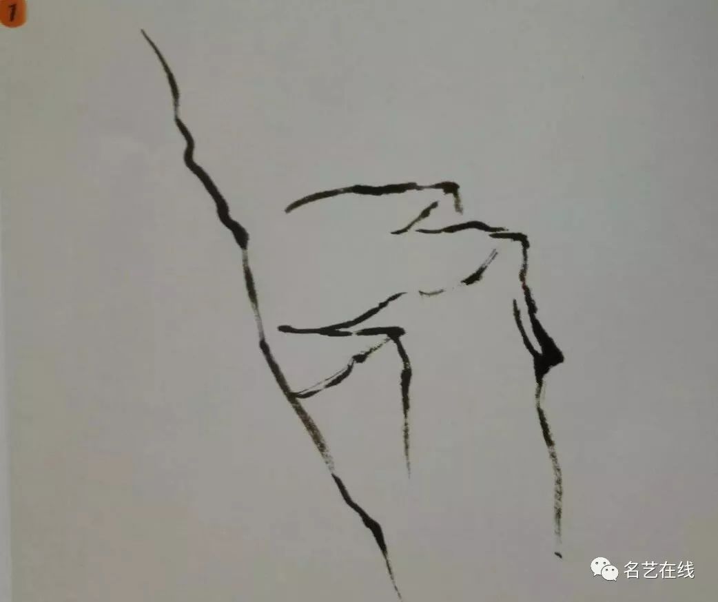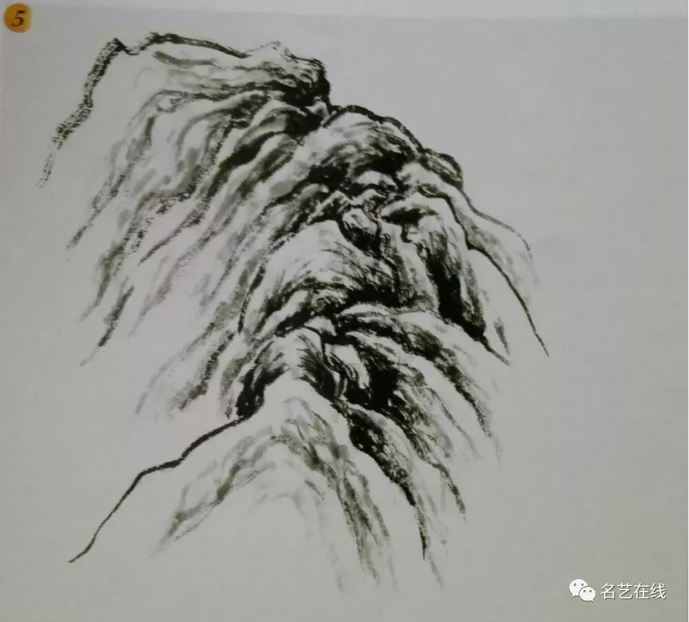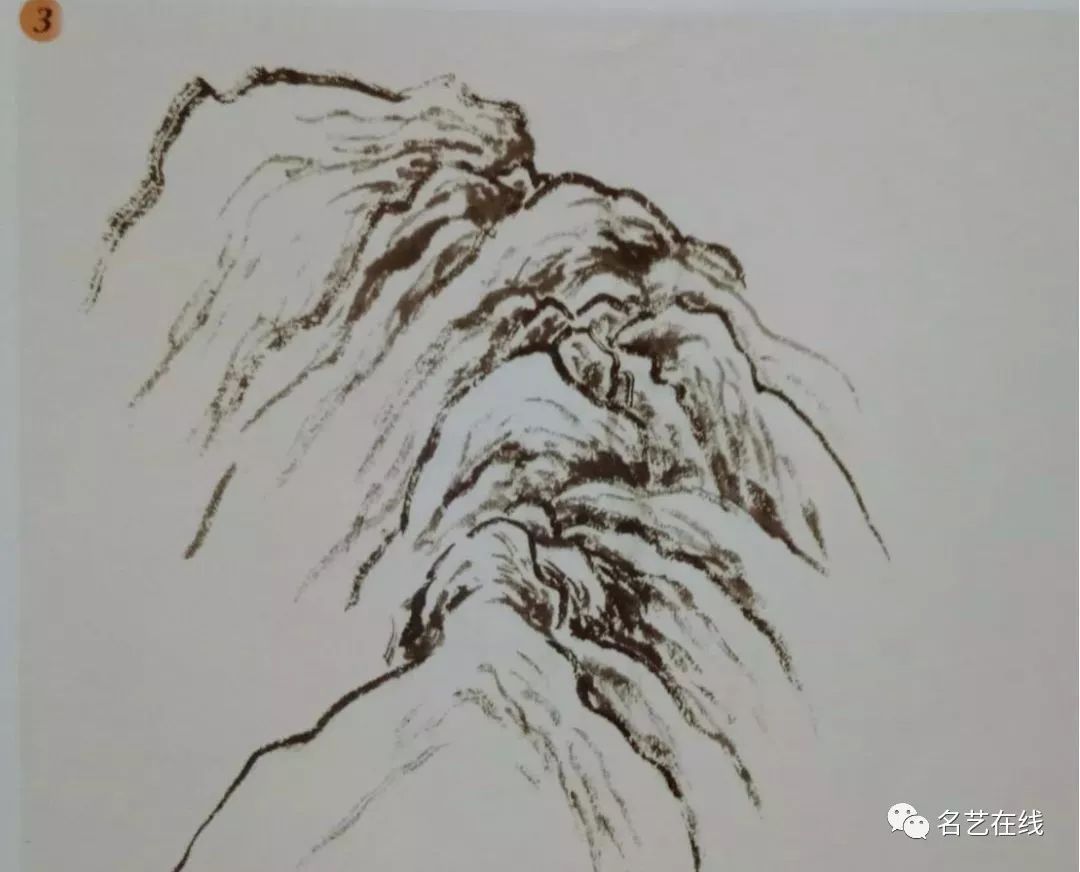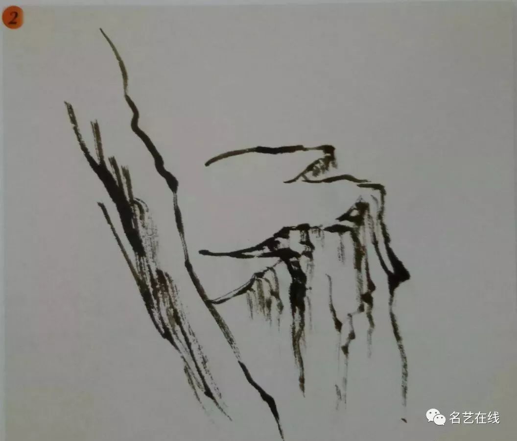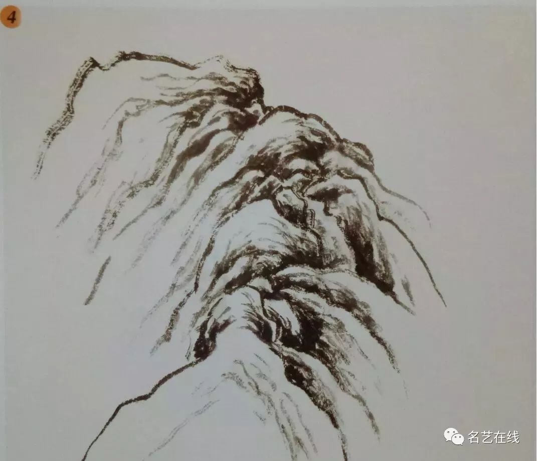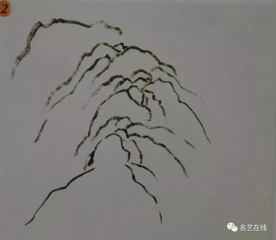 先勾大轮廓,注意用笔的浓淡干湿变化和山的脉络走向。