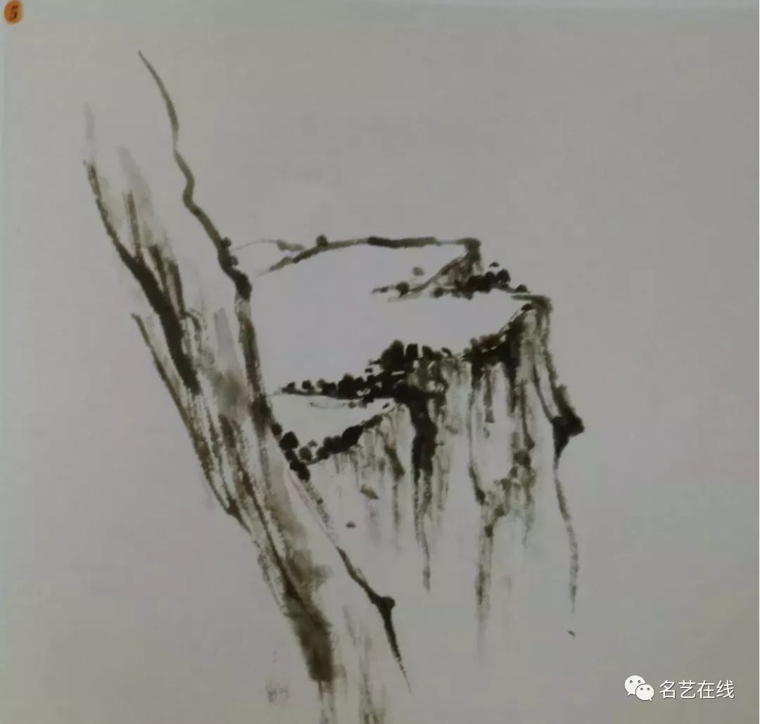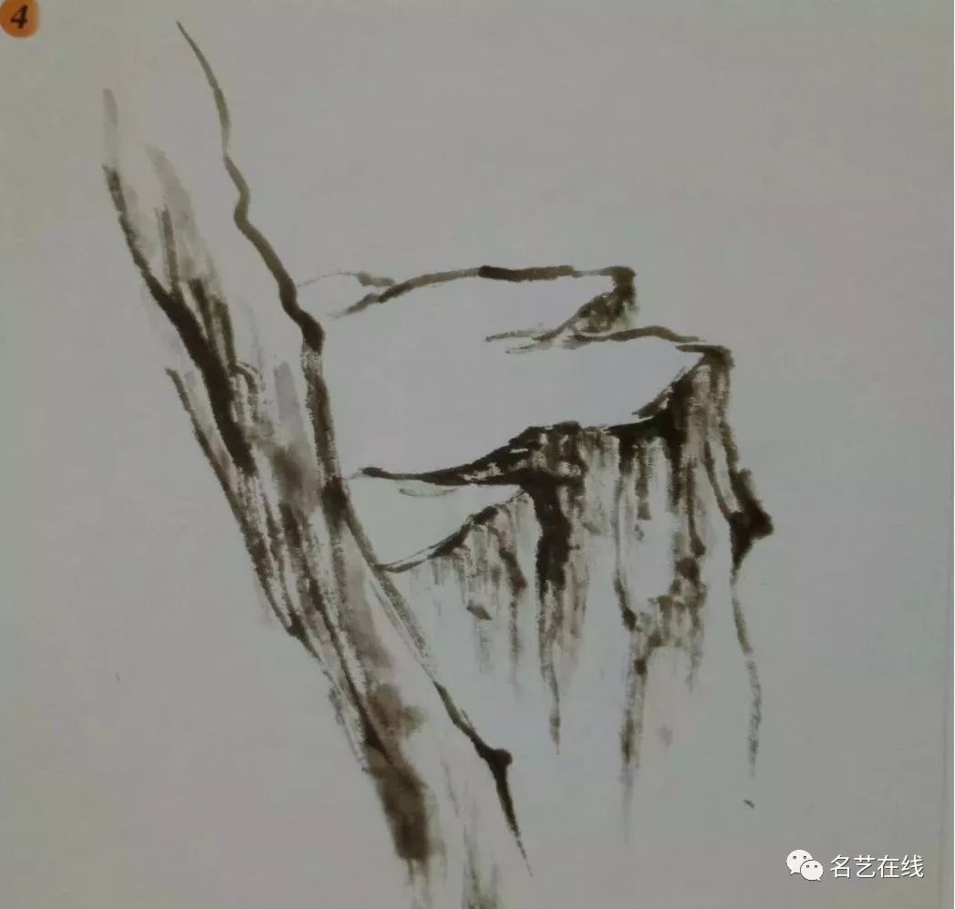 皴时用小侧锋,注意山崖上的山石结构,因是立面,所以适合用小斧劈或直线皴。