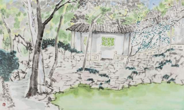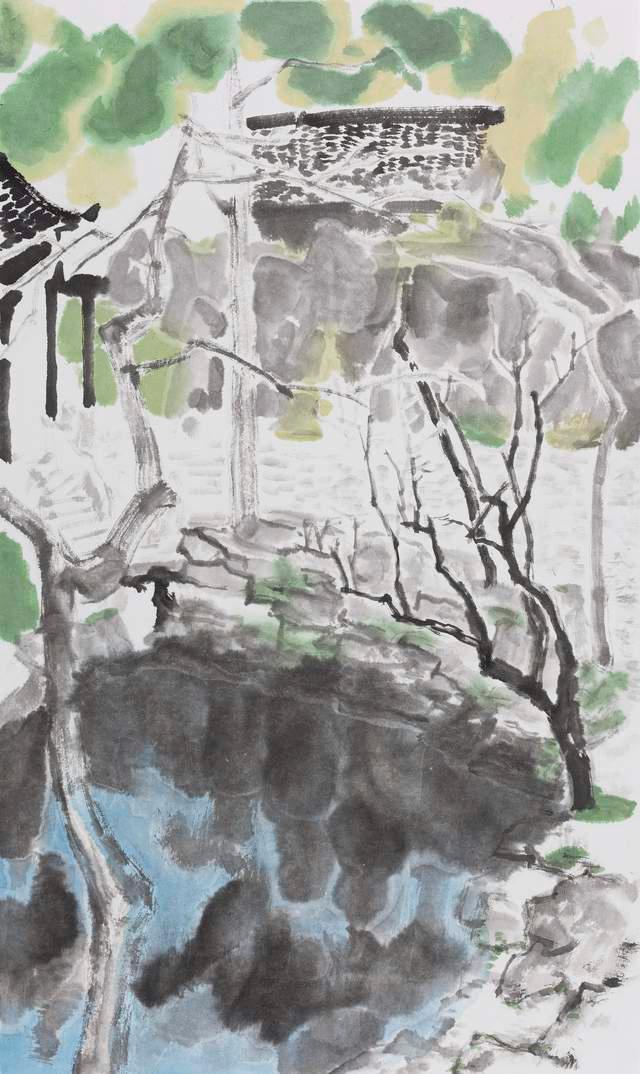 在山水画的图式上,谢岩有着敏锐的现代意识和创新眼光,他以文人般的秀敏之心,不断地进行着尝试。苏州园林是中国传统文化里一个非常璀璨的典例,在有限的空间内创造出别有洞天的景致,中国传统的审美和文化气息尽凝练于此,然而它却从来没有进入到绘画创作题材的主流中,艺术家们的目光在它身上流转又避开,偶尔取墙边一隅入画,也往往都不敢放弃它本身的面貌,可谢岩对此有自己的思考,在他的苏州园林写生系列中,已经初见端倪——那些纵横排闼的墨线,浓淡交织的色点,将观者引入一个似乎熟悉却又扑朔迷离的世界,他表示:“我画园林,但我不一定非要表达园林本身,它只是一个物象而已。”这么看的话像不像园林就并不重要了,谢岩放下了对形的执着,转而去抽取眼前物象的精神内在,宋代《图画见闻志》有云:“凡画,气韵本乎游心,神彩生于用笔。”在他的笔下,墨与色巧妙地形成了互补关系,欣赏者的心神随着笔触的跳跃而律动,形式美与笔墨意趣得到了充分的有机统一,画家自身的情怀与眼前的万千物象进行了彻底的交融。打破中西方艺术的界限,造就出一种全新的艺术语言,画具有民族风格和时代精神的画,是谢岩一直坚持的目标与方向。