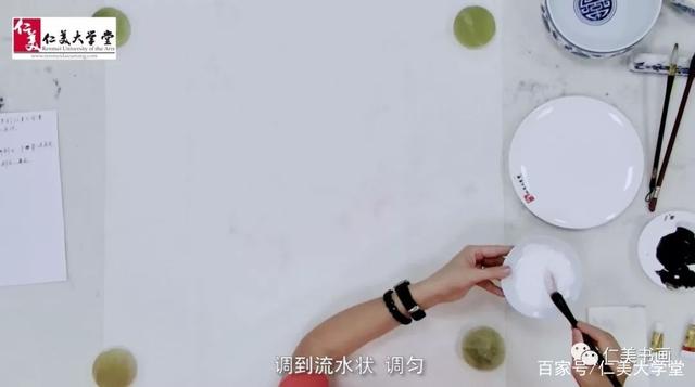 1、准备一个小盘子,钛白色加水调稀、调匀,笔上多余的水分刮掉之后将毛笔放在一边备用。