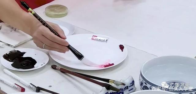 2、准备一个大盘子,在盘子的边缘挤上曙红、胭脂,然后拿刚才调白色的笔慢慢的蘸一点曙红调色,少量多次,调出牡丹花的粉色。