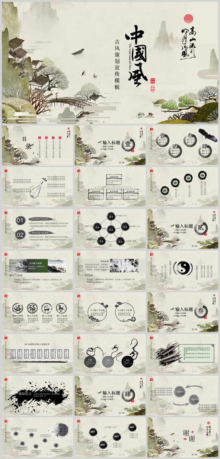 这是一套水墨山水国画背景的古典国风PPT模板,共25页;