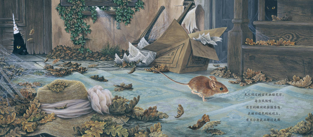 在破旧褪色的地毯上,有只小老鼠正穿过走廊。