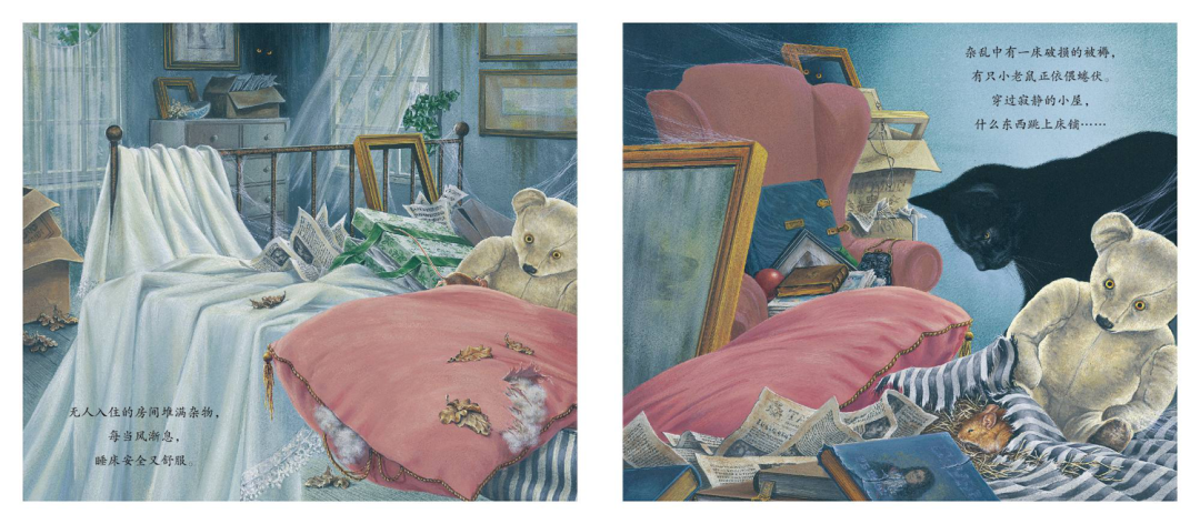 杂乱中有一床破损的被褥,有只小老鼠正依偎蜷伏。