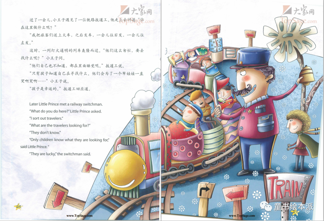 这时,一列灯火通明的列车轰隆而过。“他们这么匆忙,要去找什么呢?”小王子问。