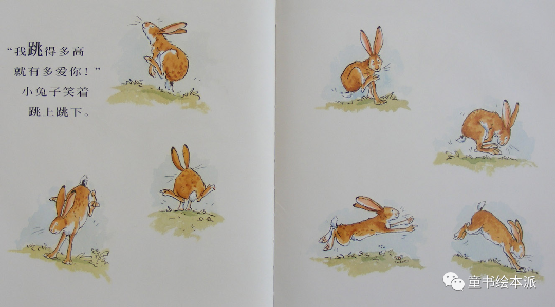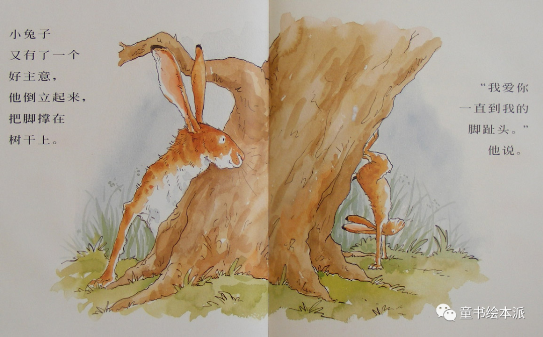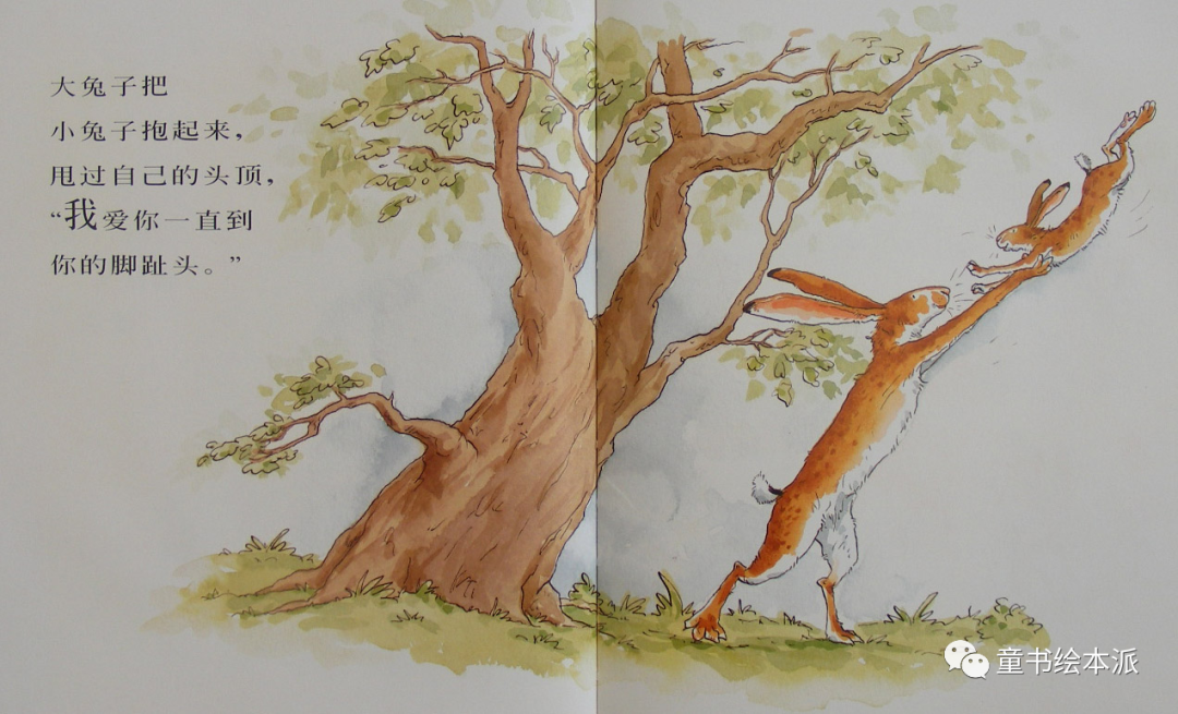 大兔子把小兔子抱起来,甩过自己的头顶,“我爱你一直到你的脚指头。”