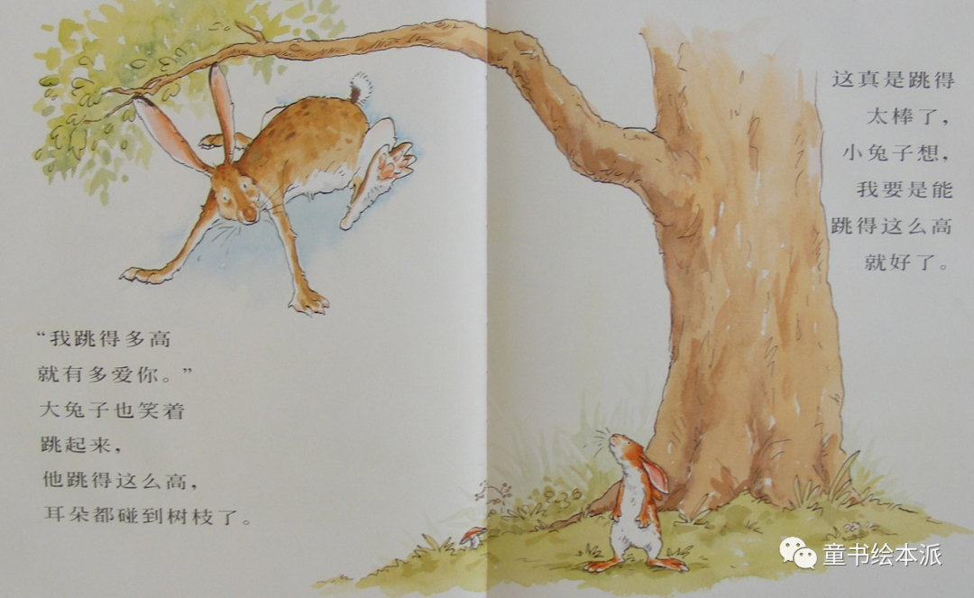 “我跳的多高就有多爱你!”大兔子也笑着跳起来,他跳的那么高,耳朵都碰到树枝了。