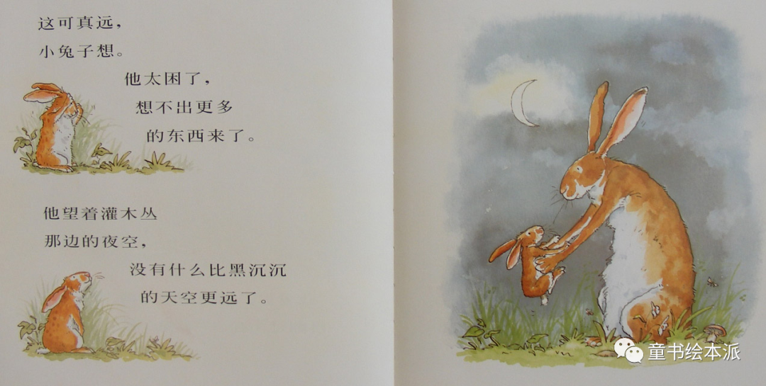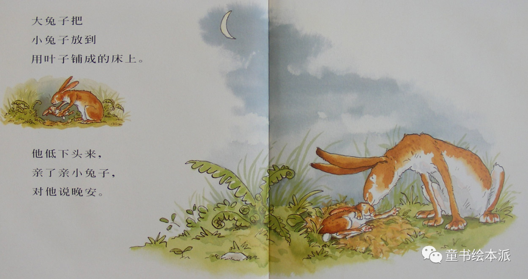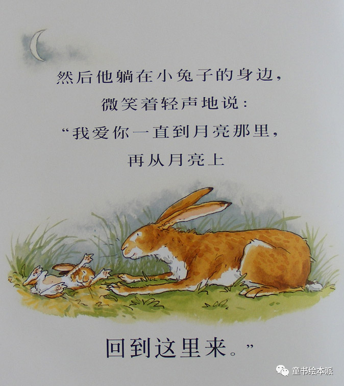 然后他躺在小兔子的身边,微笑着轻声地说:“我爱你一直到月亮那里,再从月亮上回到这里来。”