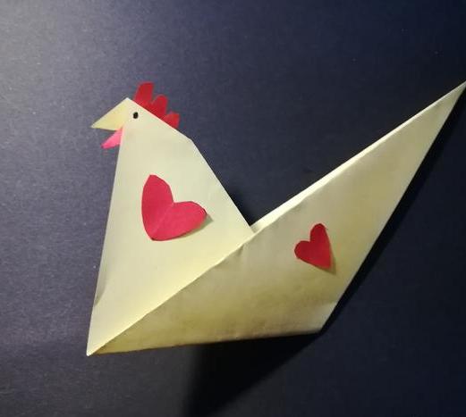 画上眼睛。剪两个红色的小爱心,贴在相应的位置上,一只简易的大公鸡就折好了。略整形后,还可以立在桌面上呢。