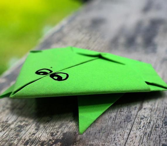 我们用笔把折纸在折纸上画画上青蛙的两个眼睛,把折纸底部的三角形用力向下折叠2次,我们用手轻轻的一按,小青蛙就能跳起来。