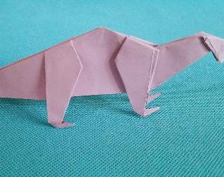 再沿中间线向内翻折,将沧龙的四只脚掏出来,处理好沧龙脚部的细节,最后将向外翻折的部分变成向内翻折,将其中的一端向内向上翻折,就变成了沧龙的颈部,再将颈部的上端向下翻折就变成了沧龙的头部,这样一只正在行走的沧龙就折好了。