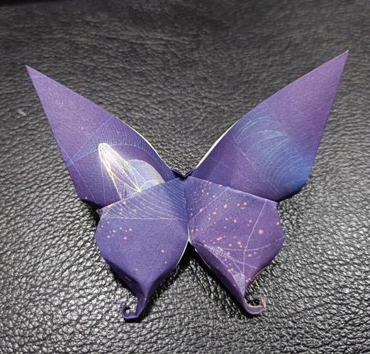 以刚刚露出尖角为准,尖角向中间卡住,最后沿着中线再折叠一下,展开,飞舞的蝴蝶就做好了。