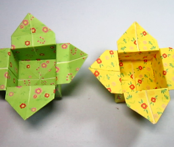 将四个长角翻开,整形,一个花朵盒子就折好了。