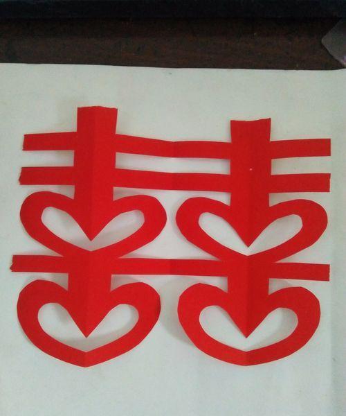 全部展开成“囍”字,剪纸完成,当然还有一种心形的,其实就是剪的时候图案不一样而已。
