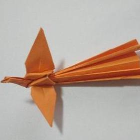 将凤凰的尾部向上翻折,形成长长的尾巴。最后从底部往凤凰身体里吹气,这样凤凰的身体就鼓起来了,然后打开翅膀和尾巴并整理好,这样一只凤凰就做好了。