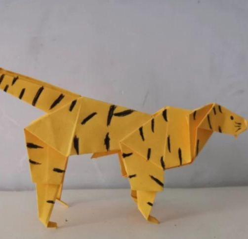 然后把老虎后背上左右2边的小三角折到里面去,这样让虎背看起来线条流畅一些,然后把肚子位置折出来,最后把4只老虎脚往前折一下。一只英勇帅气的老虎就折好了。