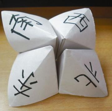 一种儿童玩的折纸游戏,把纸的四个角往里折,再反过来折,前后左右压两下,手指伸进纸下面一翻写上惩罚。东西南北,一个像猪蹄的东东。用一张正方形的纸折出来的。内侧八个面上写上一些名词,有好有坏。让小伙伴选个方向,说个数字,就开始来回折。看看选得是那个面的啥词,要是不好词,还会生气奥。一个简单的小游戏都能玩的昏天暗地的,当年的心多么的单纯啊!