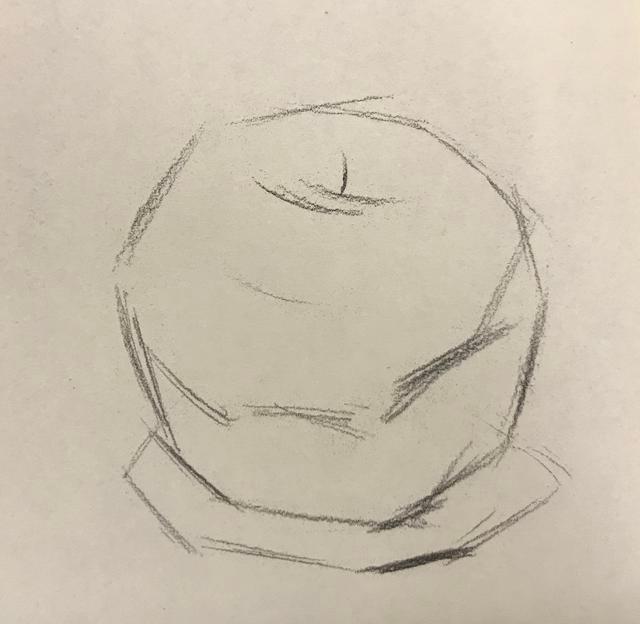 接下来我们就开始用明暗步骤去刻画,按照传统素描的学习方法,先用长直线画出高度和宽度,四个角切掉,然后再切八个角,就成一个圆形了。那造型能力强的同学干脆直接画一个圆形也是可以的。