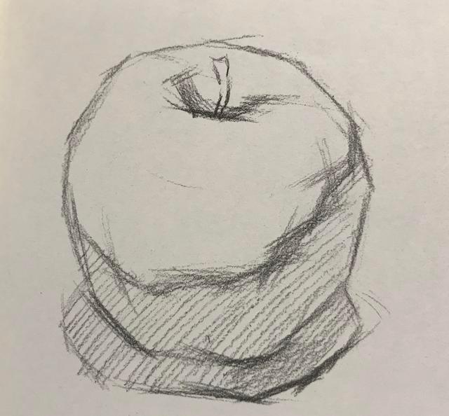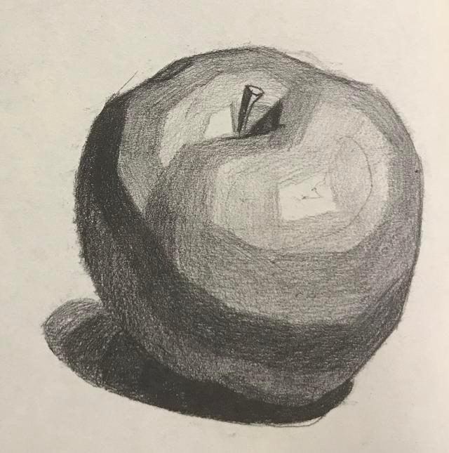 苹果虽然是圆的,但是我们在画的过程中可以用块面的方法去概括,从大块面到小块面,苹果就圆了,明暗交界线要依附着结构去画。