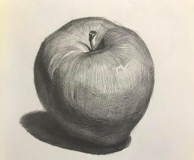 那苹果是有弧度的,调子当然也要跟着结构和明暗交界线走,也要注意它最亮和最暗的地方。苹果是有它的固有色,红色、绿色、黄色等等不同颜色,画的时候不能像画石膏一样对比强烈就好。