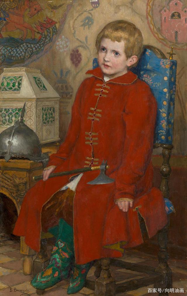 维克多·瓦涅佐夫的画作《年轻的梦想》,这是这位艺术家最具浪漫色彩的儿童画作之一,让人想起莫斯科皇室宫廷的父权氛围。这位艺术家将这幅作品的创作时间定在1918年和1922年,但它很可能是更长的创作探索时期的产物。它最初的版本似乎是在瓦涅佐夫创作的另一幅作品《博扬》(《吟游诗人》。瓦涅佐夫经常花费数年时间绘制他的标志性史诗帆布画,1911年在罗马的一个国际展览上展出。画中的主要人物之一,一个男孩和王子的随从一起,聆听英雄民谣歌手的歌声,是画家根据他为儿子弗拉基米尔画的肖像素描画的。瓦斯内索夫最小的儿子,1889年出生在基辅,当时他的父亲正在为圣弗拉基米尔大教堂的壁画工作,在世纪之交,他经常坐在那里拍摄历史和福音题材的照片。弗拉基米尔当然也是被拍卖作品的模特。一个浅棕色头发、皮肤白皙的男孩,正如米哈伊尔·涅斯捷罗夫恰当地描述的那样,他是“瓦斯涅索夫式的人物”,非常适合描绘“老俄罗斯”人物的特征,这些人物的真实性一直是艺术家非常关心的问题,他的作品体现整体历史氛围。