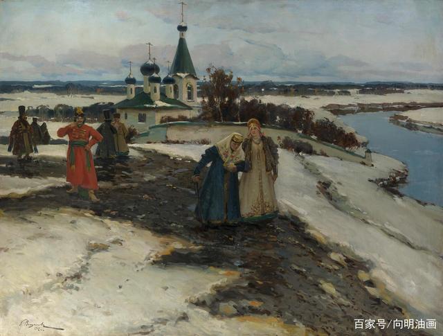 5.韦斯特奇洛夫,康斯坦丁(1878-1945) ,《在从教堂出发的路上》,签名并注明日期为1912年,还进一步签名并注明在牧师名单上。帆布油画,115.5 × 151.5厘米。