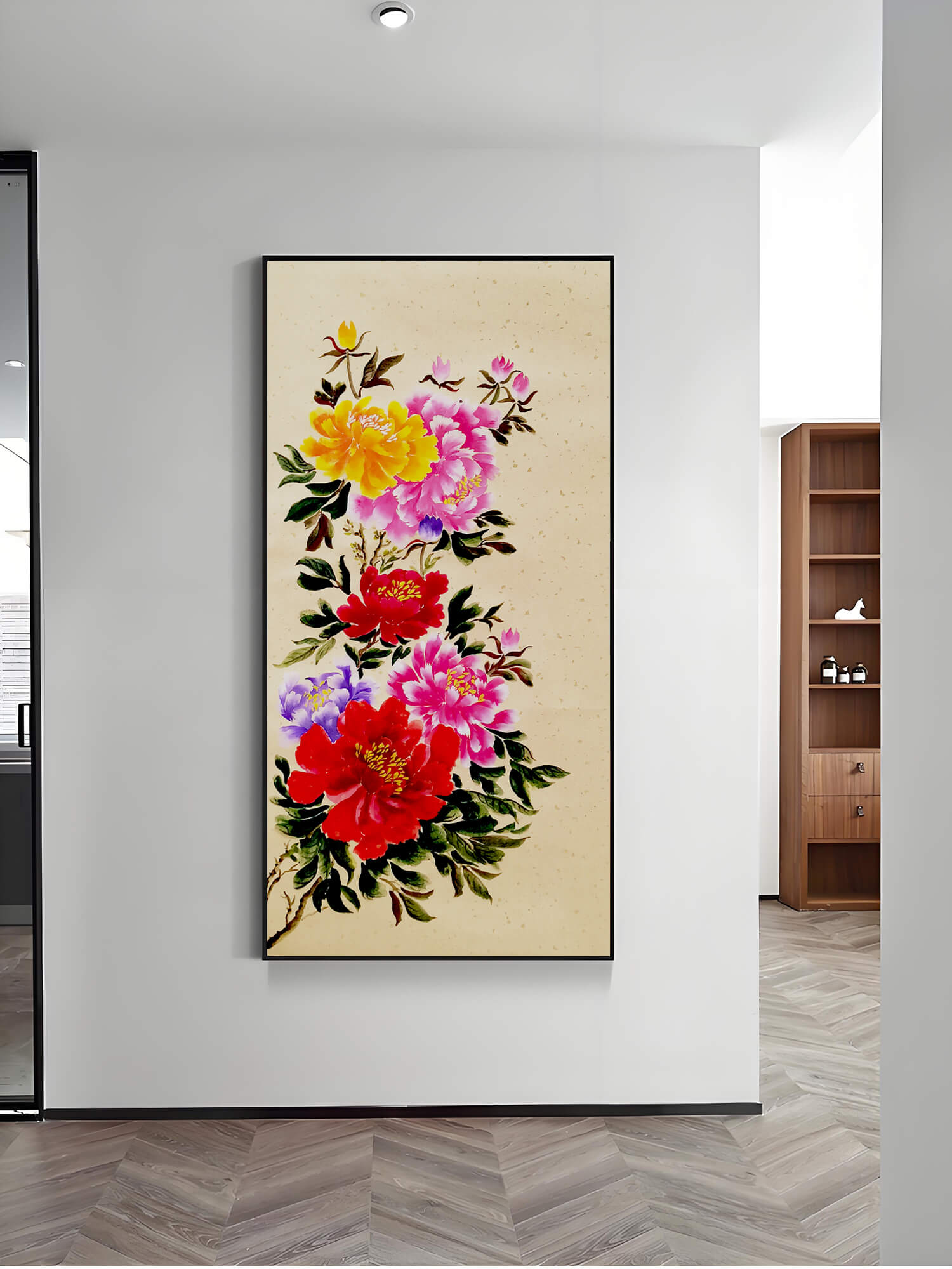 纯手绘工笔重彩,画家倾心绘制六朵盛放牡丹,层层晕染,花瓣娇嫩欲滴,枝叶灵动舒展,金蕊点缀其间,寓意“富贵吉祥、繁荣满堂”。